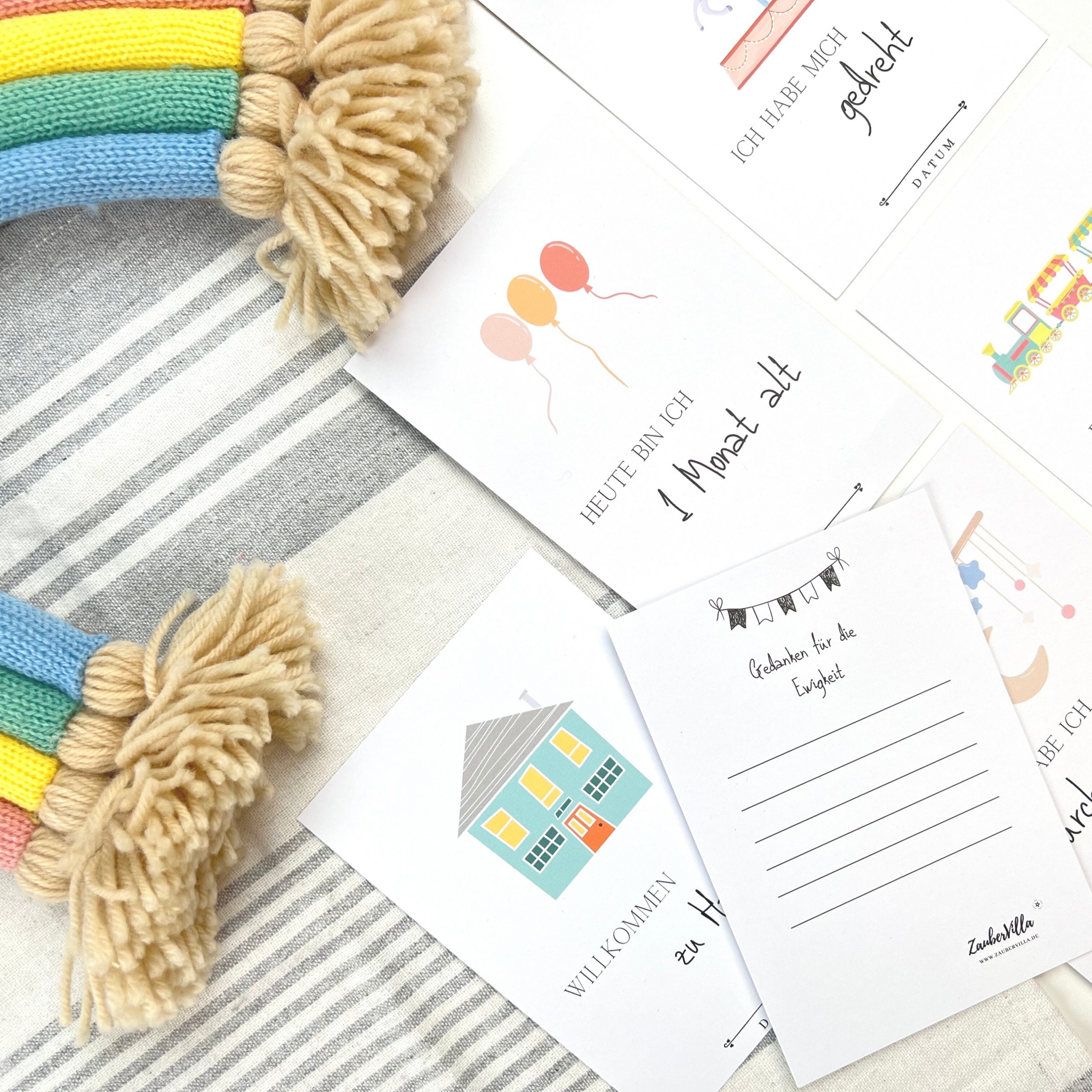 Das erste Jahr mit Baby ist etwas ganz besonderes! Damit die Erinnerung nicht zu schnell verfliegt, können die wichtigsten Momente und Meilensteine mit dem Meilensteinkarten „Mein 1. Jahr“ von der zaubervilla festgehalten werden! Schnapp dir eine passende Karte, schieß ein schönes Foto von deinem Schatz mit der Karte und platziere es in deinem Erinnerungsalbum.